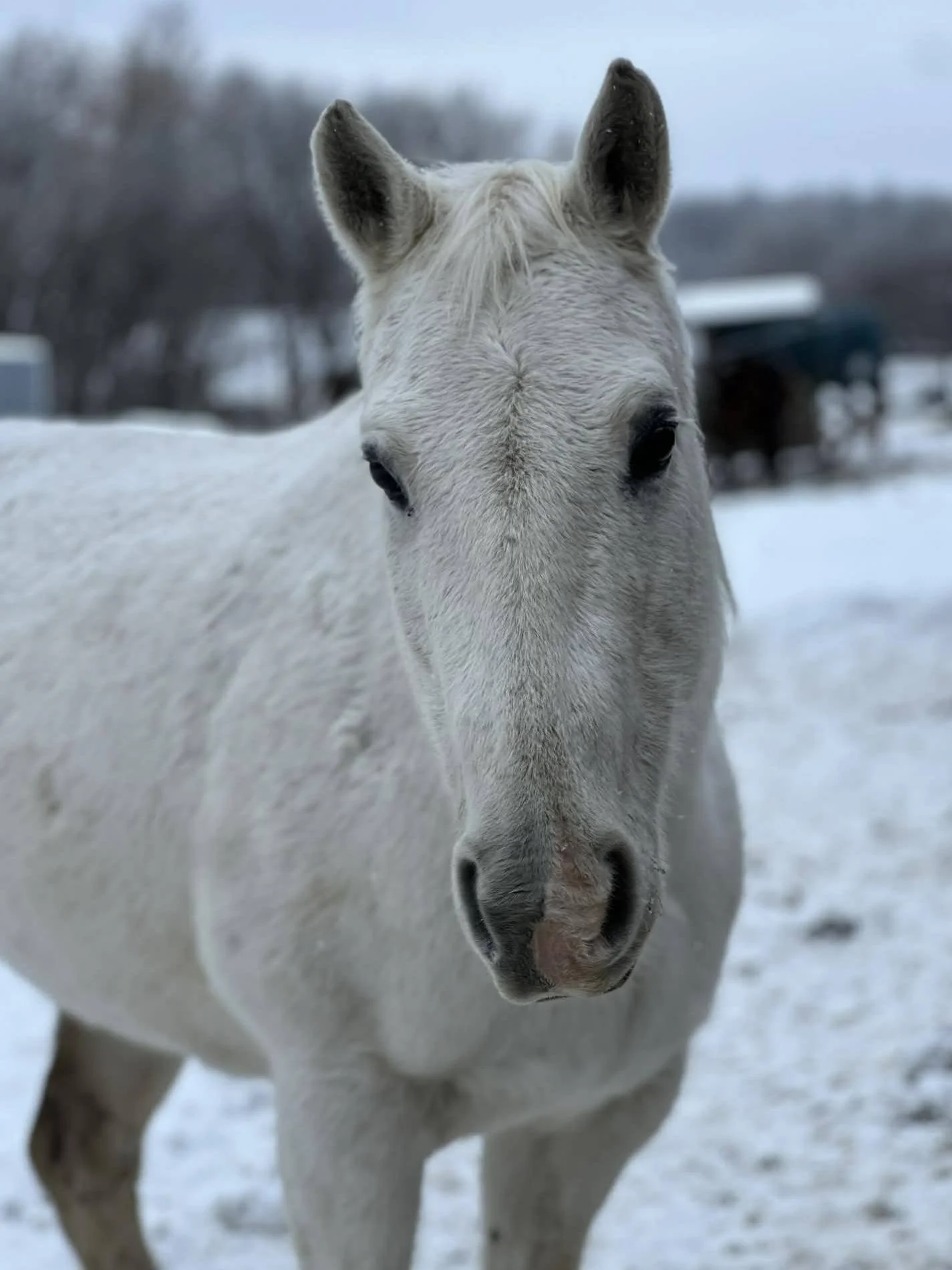 Frosty is one of a group of four horses who came to GRG as an emergency case in December, 2025. With sub-zero temperatures, we knew that this quartet would be struggling to survive (if they did) and needed our help immediately. Lacking vet and farrier care throughout their lives, they needed ALL the things. They are sweet, kind, well-mannered horses, and they seem to be genuinely grateful to have joined the GRG Ranch family.